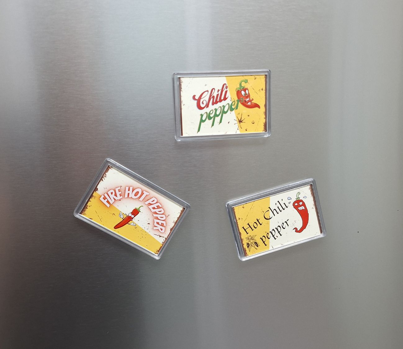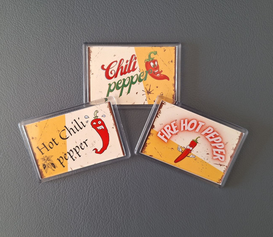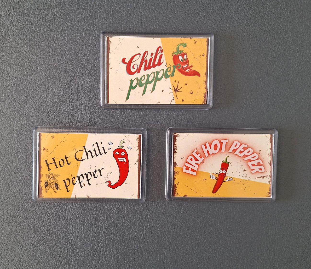 3 מגנטים מעוצבים עם איורים וינטג'יים משגעים ומשפטים שנונים על פלפלים חריפים: "Chili pepper", "Hot Chili pepper" ו-"FIRE HOT PEPPER".