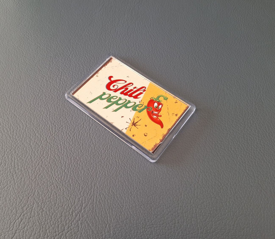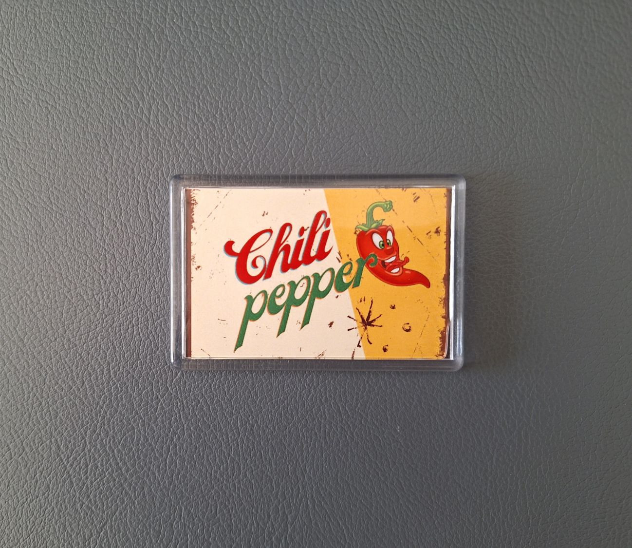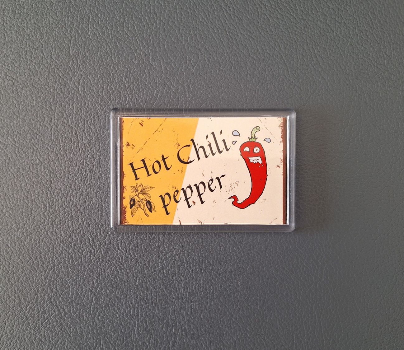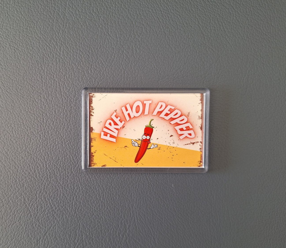 3 מגנטים מעוצבים עם איורים וינטג'יים משגעים ומשפטים שנונים על פלפלים חריפים: "Chili pepper", "Hot Chili pepper" ו-"FIRE HOT PEPPER".