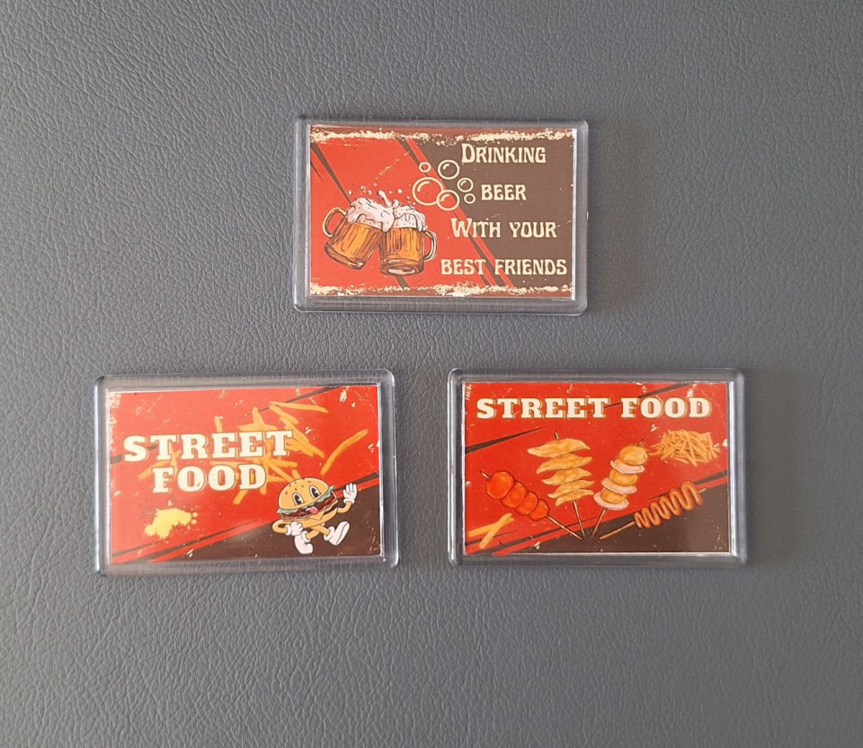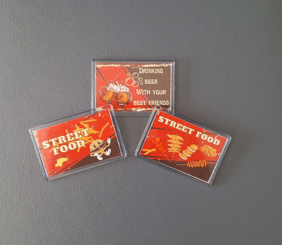 הכניסו למטבח שלכם אווירה צבעונית, שובבה וטעימה במיוחד עם סט ייחודי של שלושה מגנטים בעיצוב רטרו אוכל רחוב!