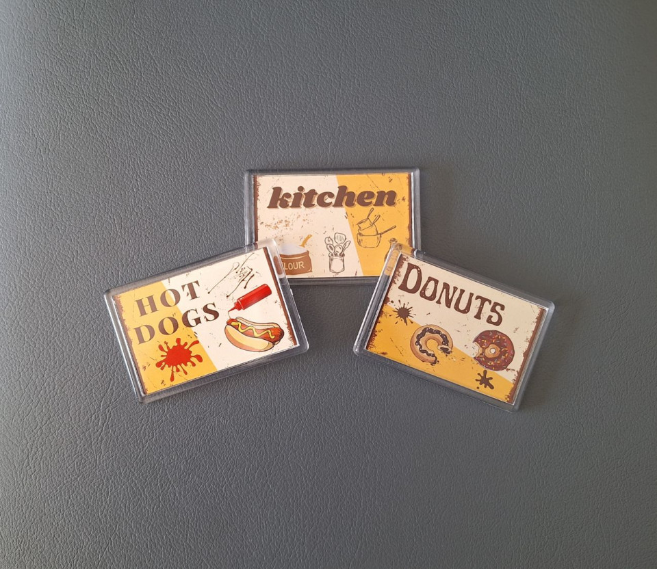 סט 3 מגנטים נוסטלגי קשיחים אקריליק – נקניקיה חמה, דונאטס וקצת סטייל למטבח שלך