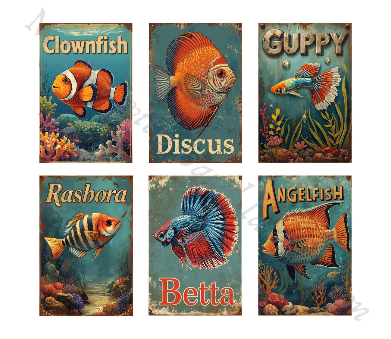 סט 6 מגנטים קשיחים עם למינציה, המציגים איורים מהממים של דגים יפיפיים בעיצוב וינטג’ נוסטלגי.