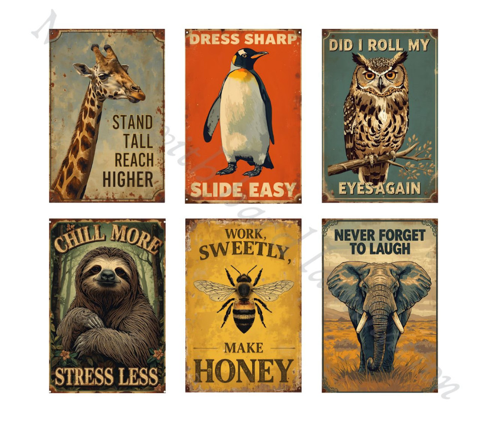 סט 6 מגנטים קשיחים עם למינציה איכותית, המציגים חיות שובי לב בשילוב משפטי השראה קצרים ומצחיקים באנגלית — שילוב מושלם בין סטייל הומוריסטי לעיצוב נוסטלגי.