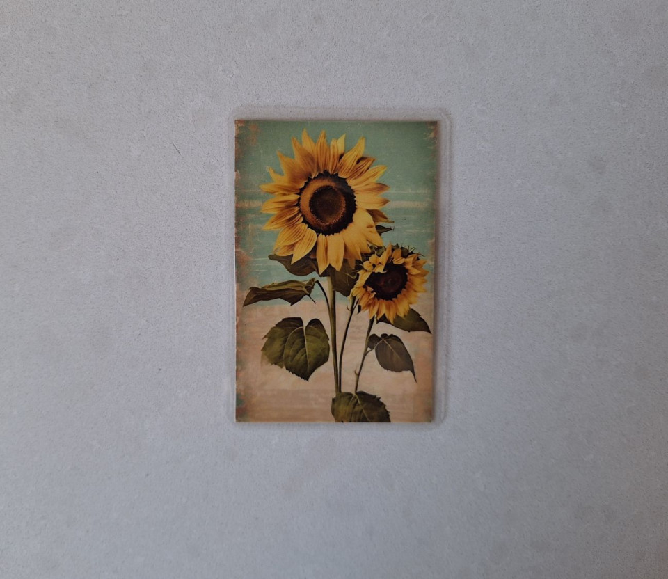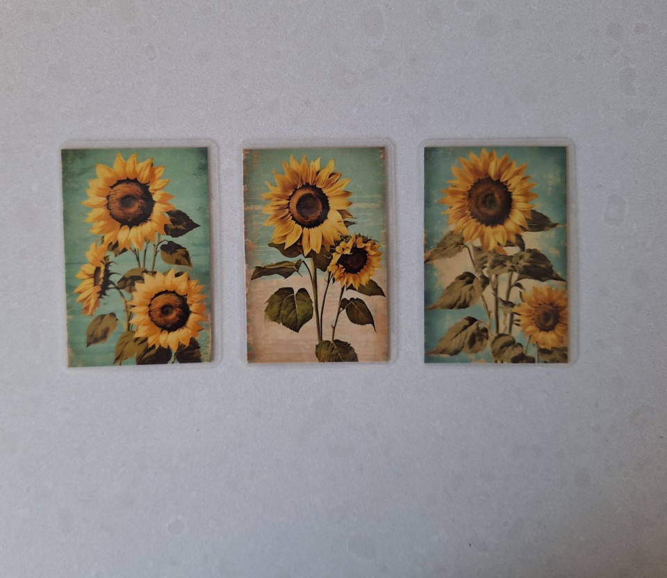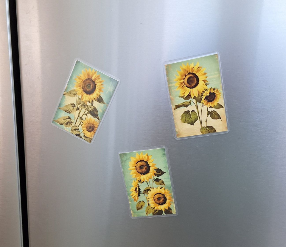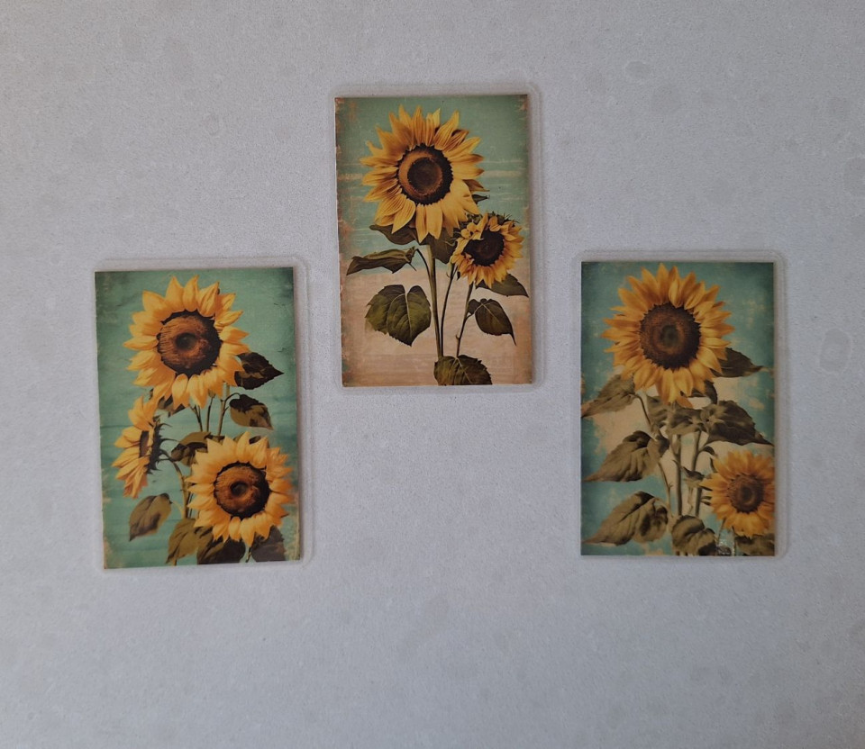 סט 3 מגנטים קשיחים עם למינציה דגם חמניות סגנון וינטג' רטרו למקרר ולוח מתכת