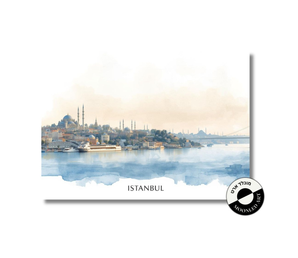 האיור מציג את קו הרקיע האייקוני של איסטנבול לצד הים, עם סגנון גרפי נקי ודקורטיבי שמוסיף עומק.