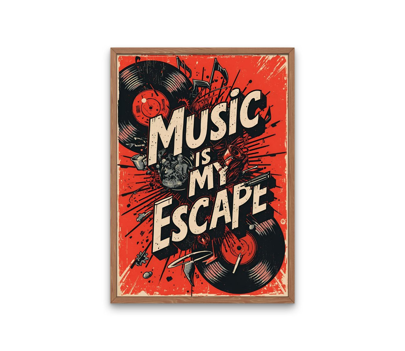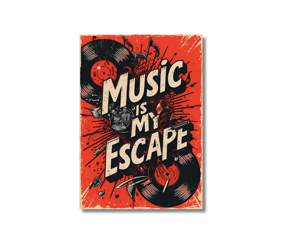 פוסטר מעוצב שמעביר מסר ברור: המוזיקה היא הבריחה, השקט והחופש. עיצוב רטרו עם וייב מוזיקלי שמכניס אופי