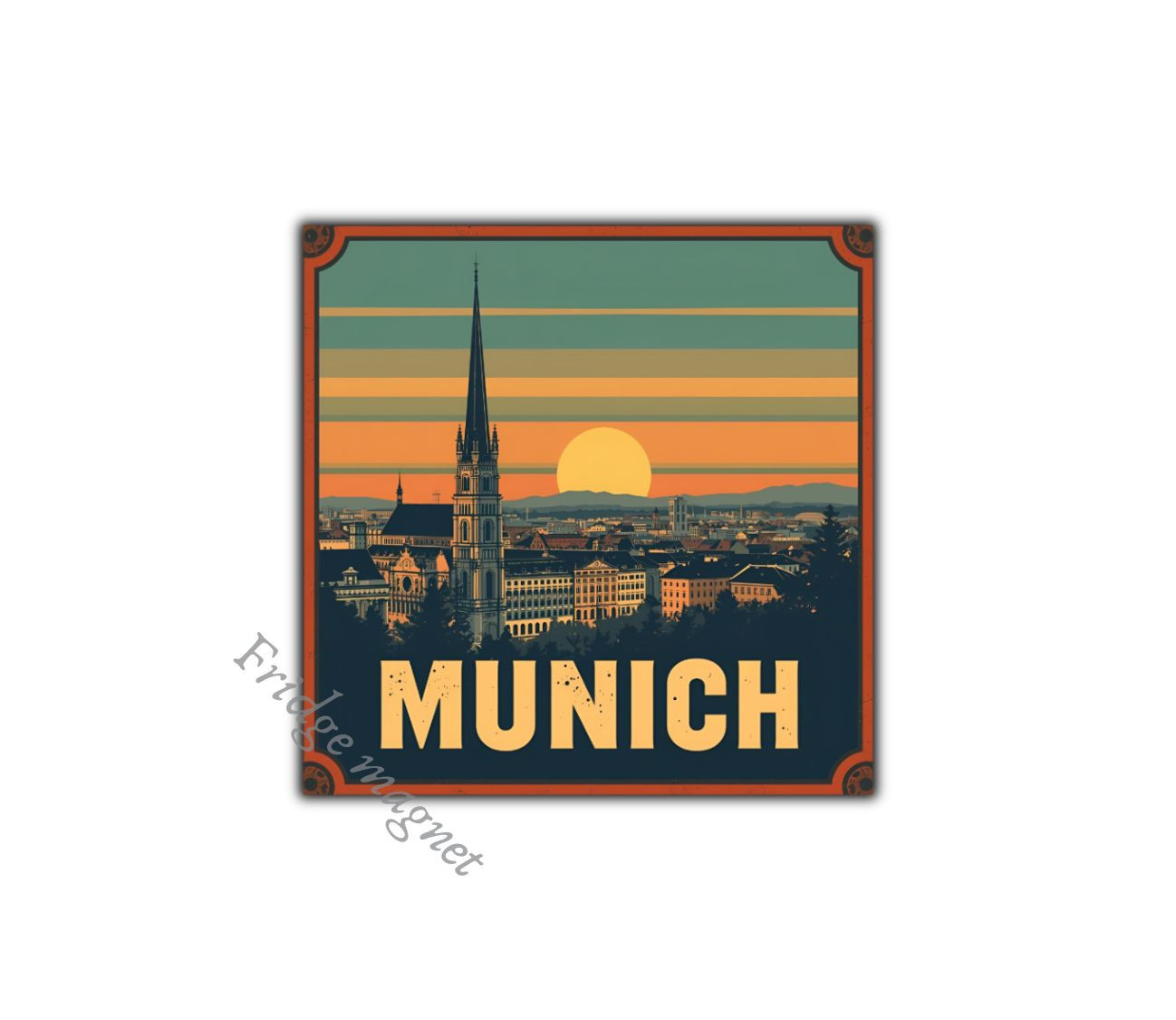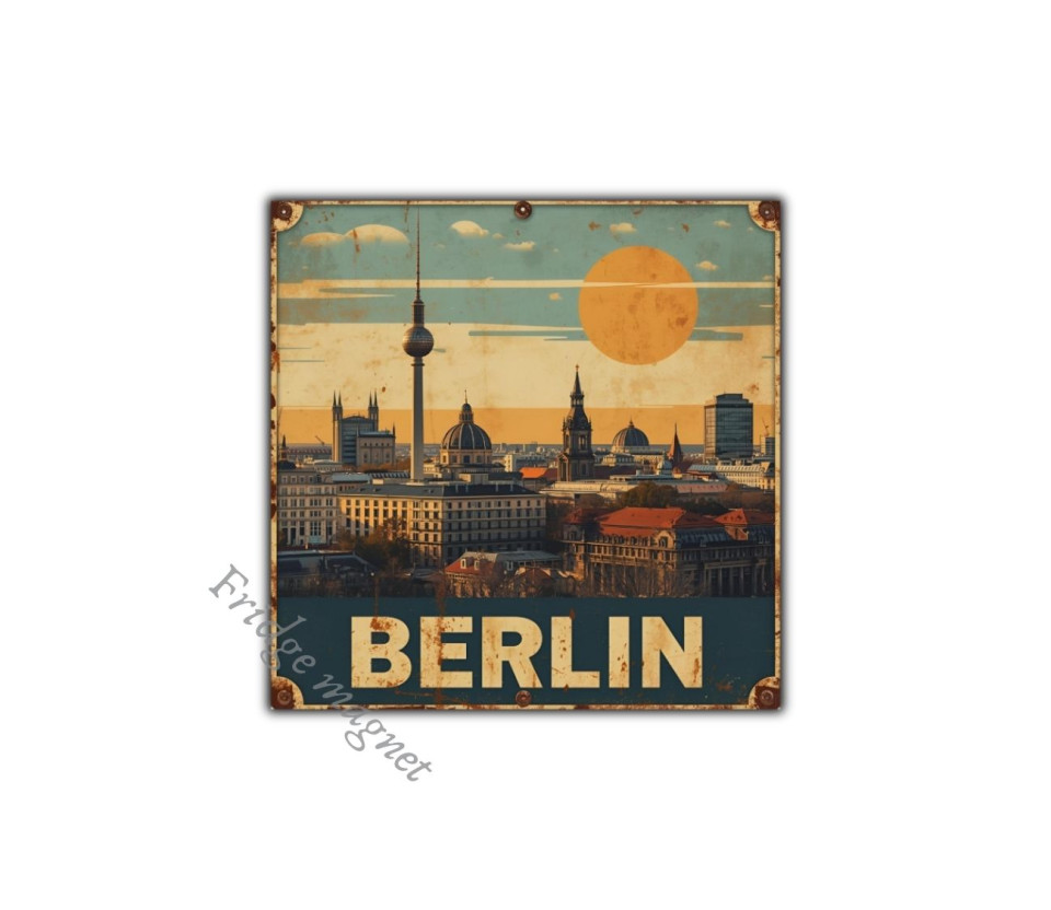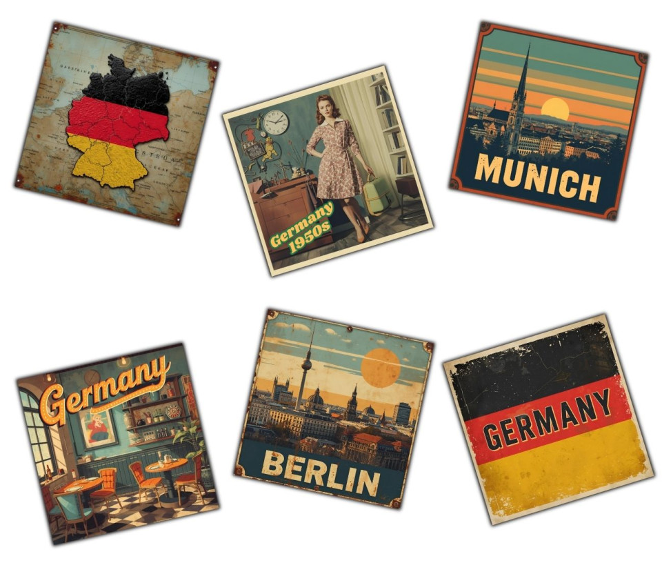 סט 6 מגנטים קשיחים עם למינציה מבריקה, בעיצוב רטרו וינטג' ייחודי, המציג את הקסם של גרמניה — כולל ברלין, מינכן.