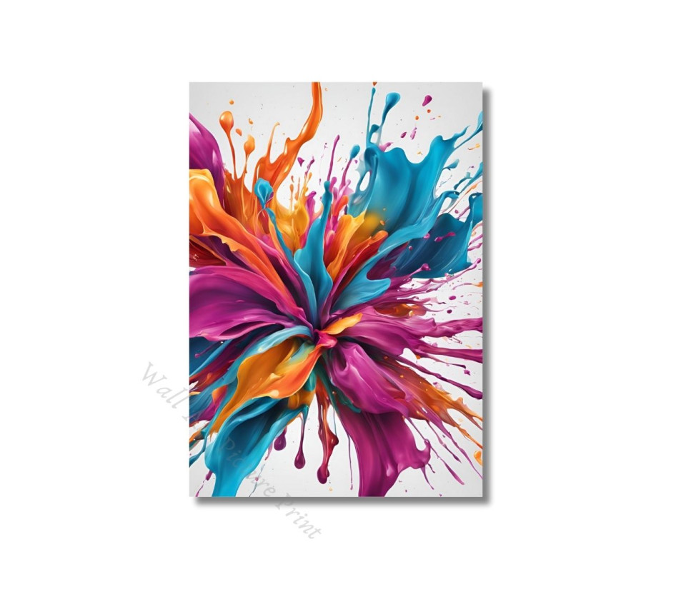 פוסטרים צבעוניים בעיצוב אמנותי עכשווי של התזות צבע מרהיבות – שילוב של גווני ורוד, כתום, כחול וסגול היוצרים אפקט דרמטי ומלא חיים.