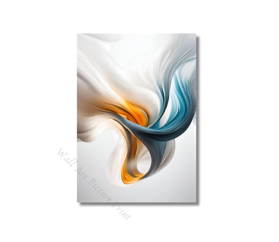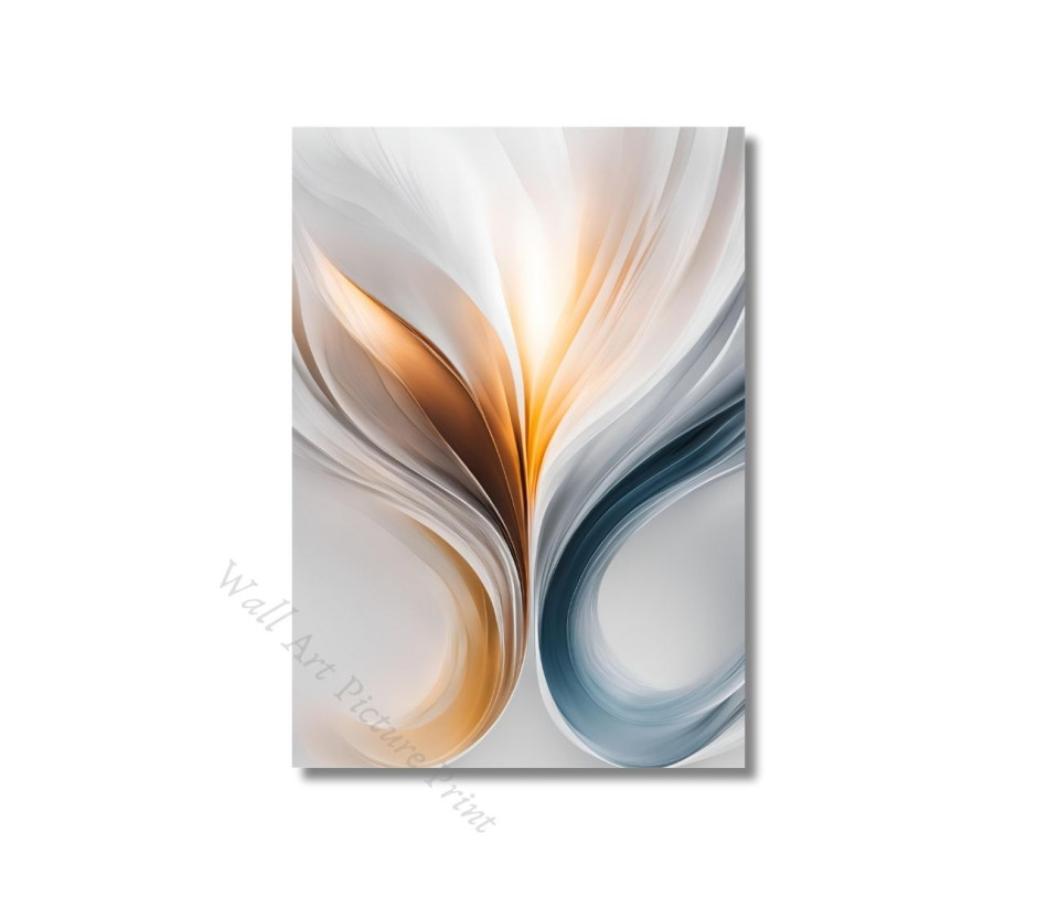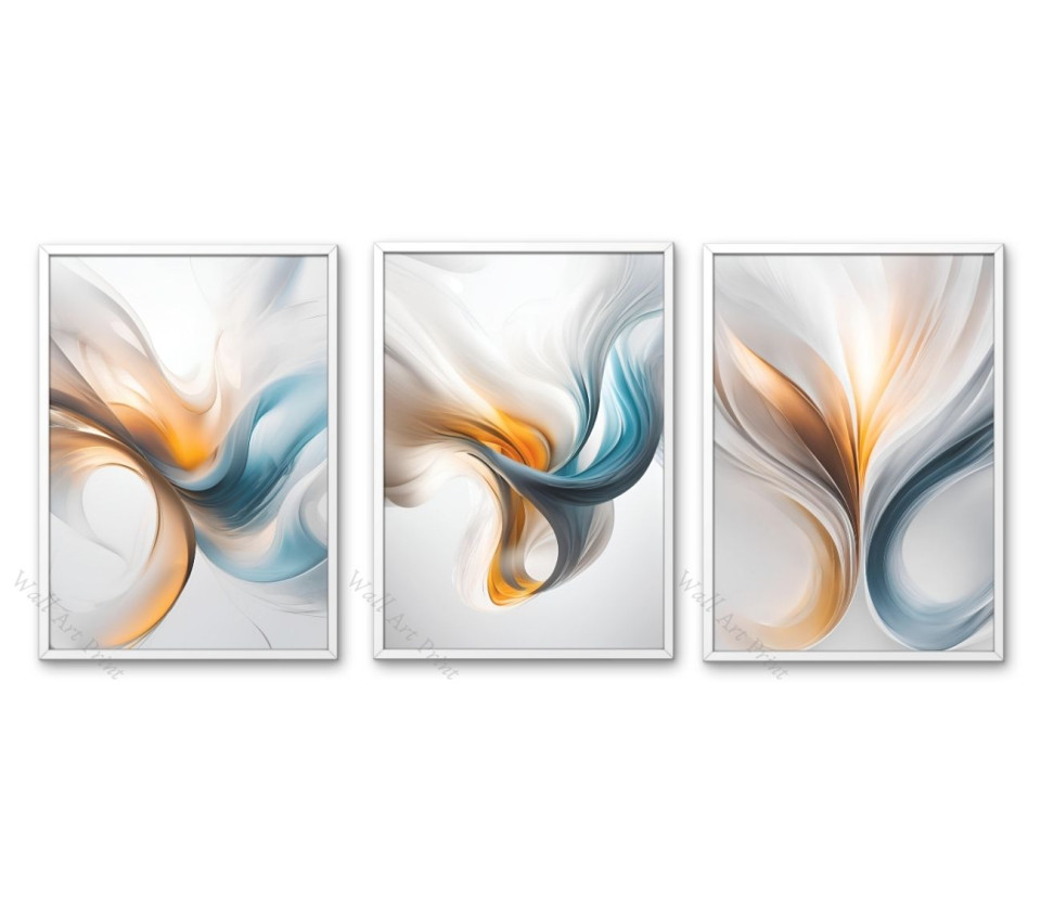 שלישיית הדפסי קיר בסגנון אבסטרקטי עדין, עם גוונים מרהיבים של זהב, תכלת ולבן המשתלבים בהרמוניה מושלמת.