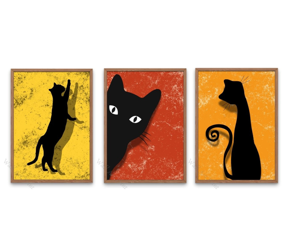 סט 3 פוסטרים מעוצבים בסגנון מודרני עם איורי חתולים שחורים על רקעים צבעוניים – שילוב מושלם של הומור, חן ואמנות לקירות הבית.