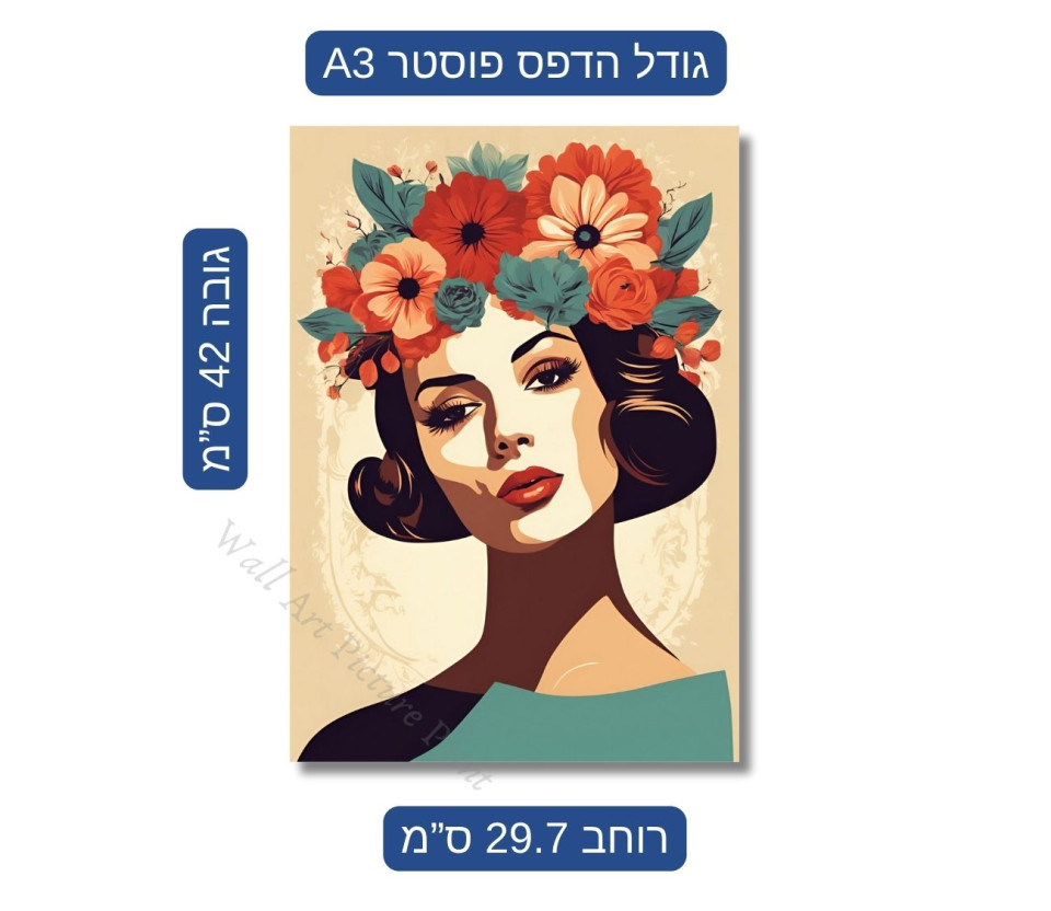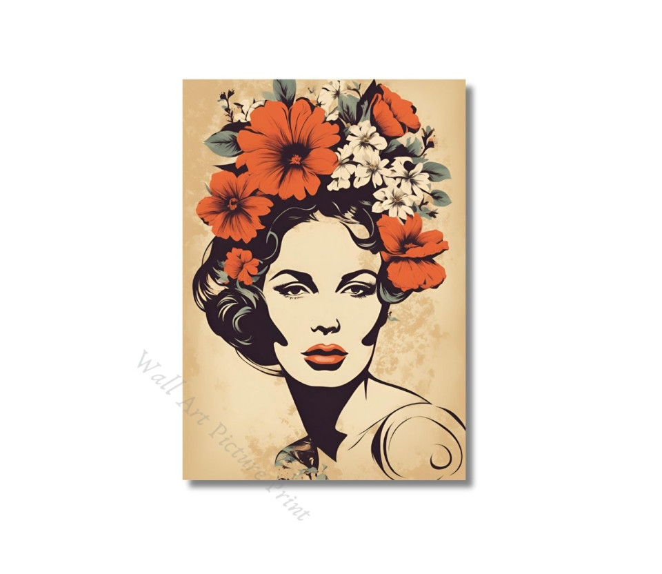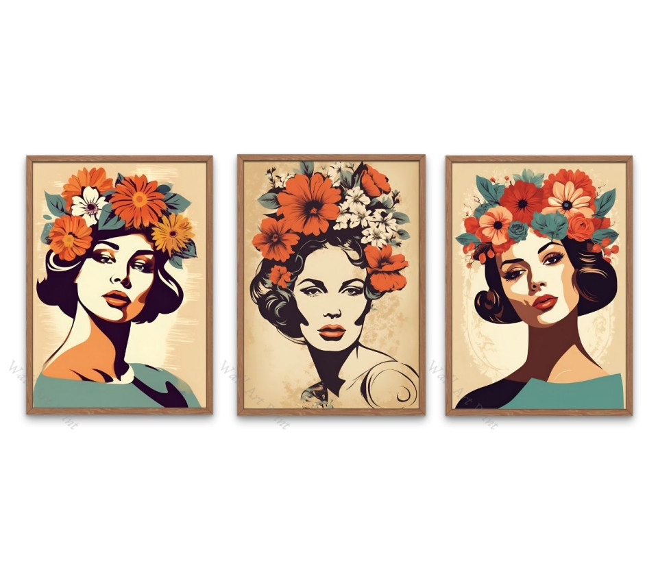 הכניסו נגיעה של אלגנטיות וקלאסיות לבית שלכם עם סט של 3 פוסטרים מרהיבים המציגות נשים יפות עם פרחים צבעוניים על הראש בסגנון רטרו ייחודי.