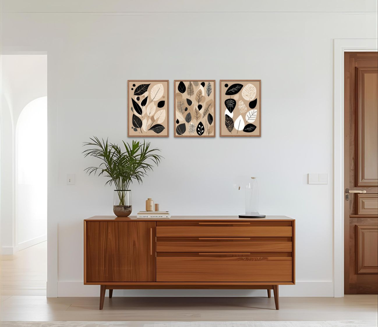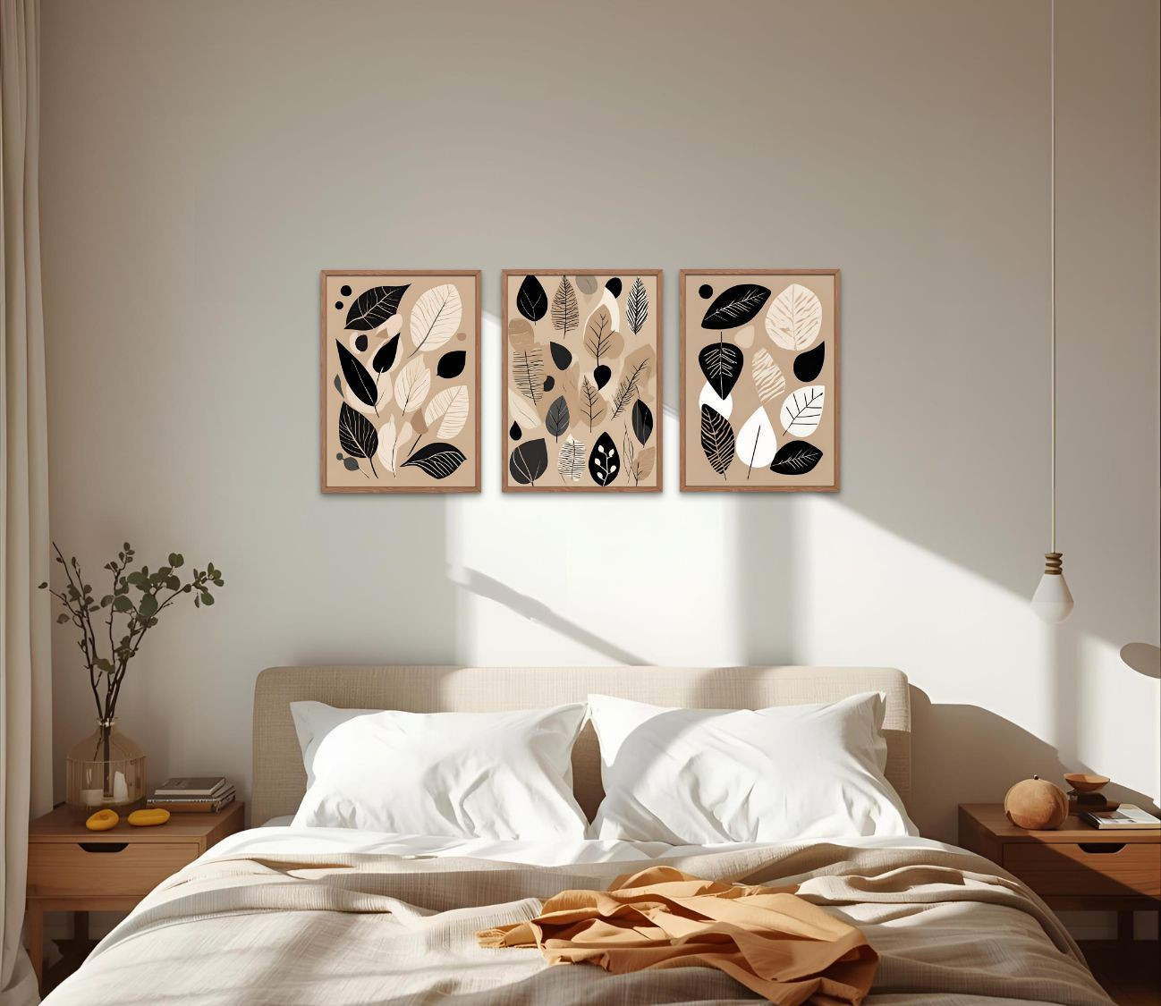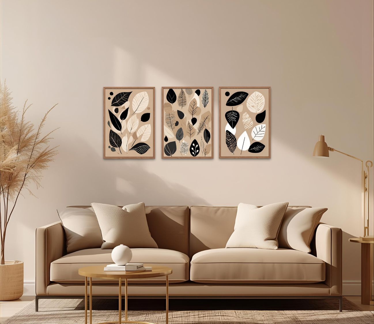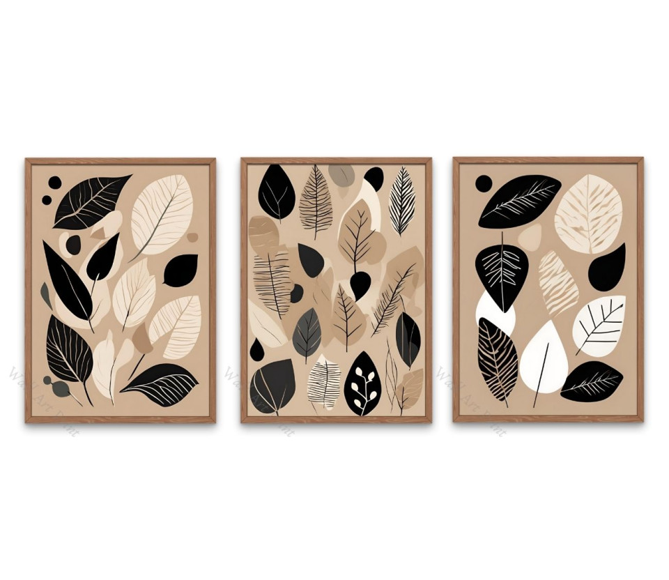 הביאו תחושת טבע ועיצוב מודרני לכל קיר עם סט שלושה פוסטרים מעוצבים בהשראת עלים, בגוונים חמים של חום לצד שחור ולבן אלגנטי.