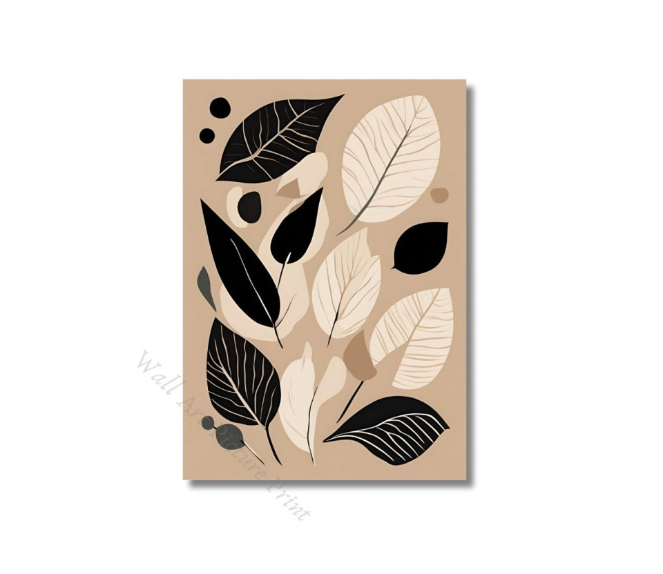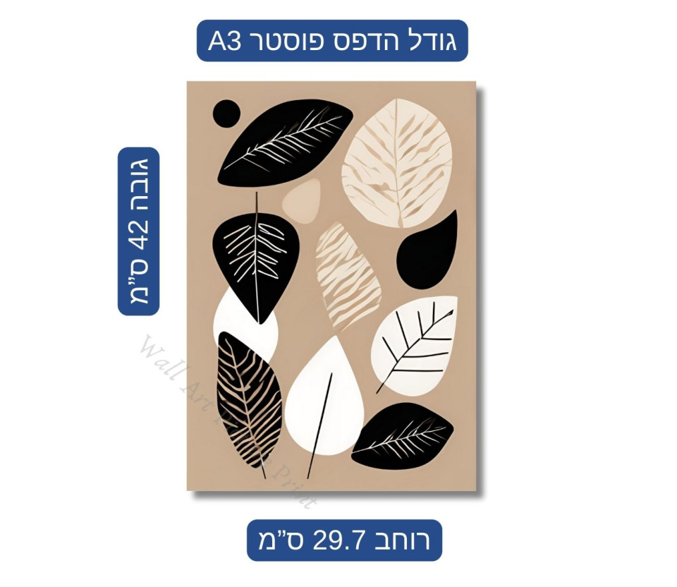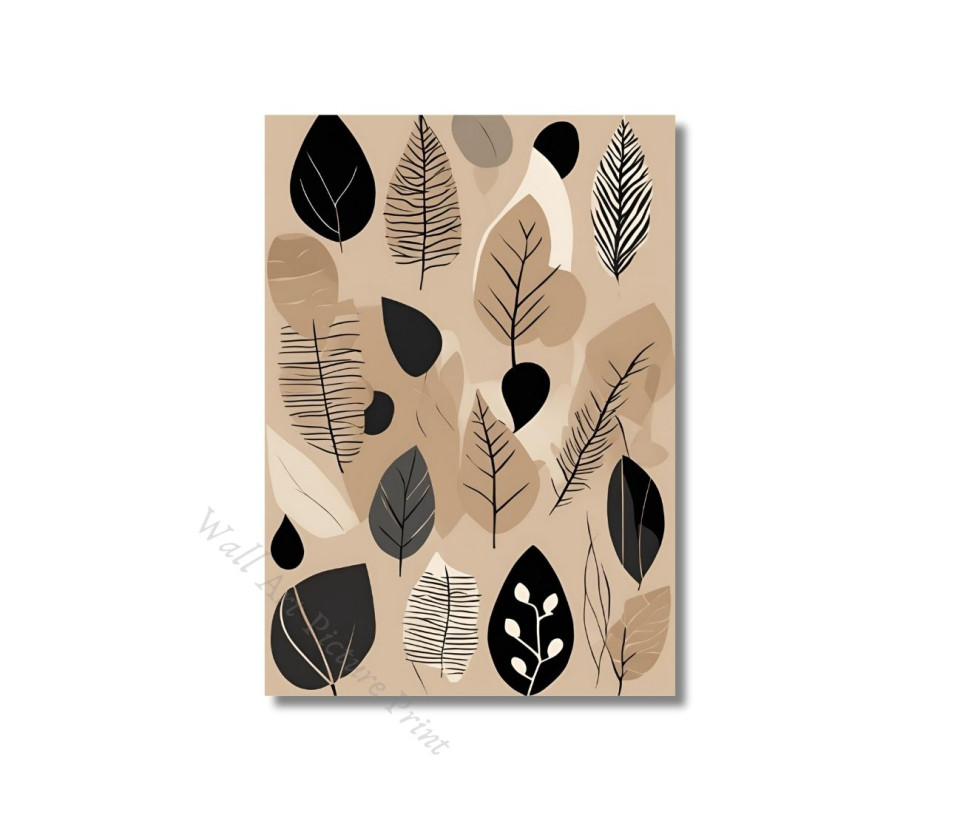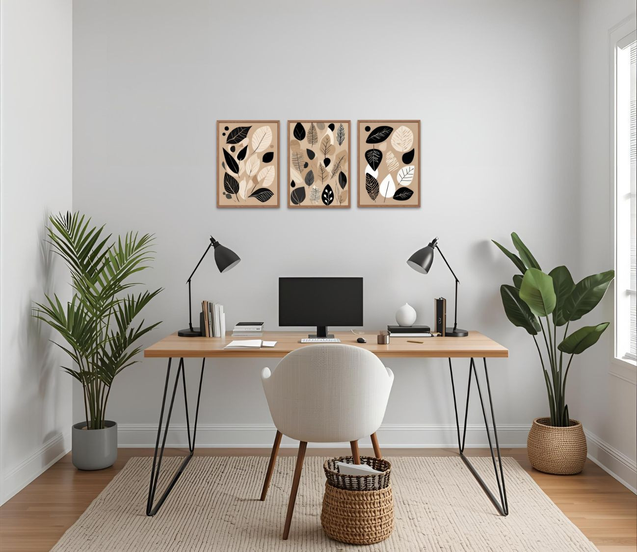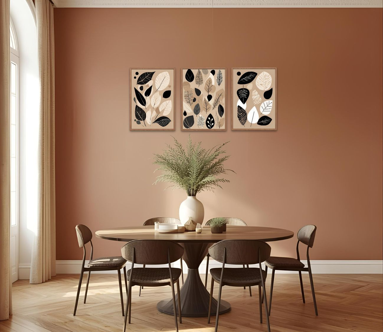 הביאו תחושת טבע ועיצוב מודרני לכל קיר עם סט שלושה פוסטרים מעוצבים בהשראת עלים, בגוונים חמים של חום לצד שחור ולבן אלגנטי.