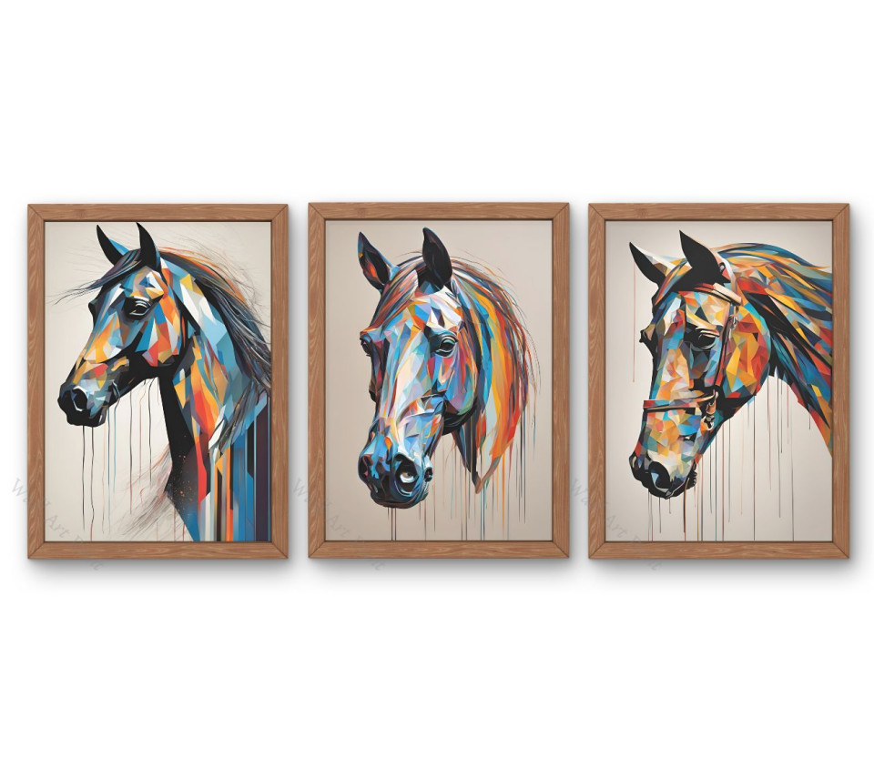 סט 3 פוסטרים בעיצוב מודרני ייחודי, המציגים סוסים מלאי עוצמה בצבעים חיים ומלאי אנרגיה.