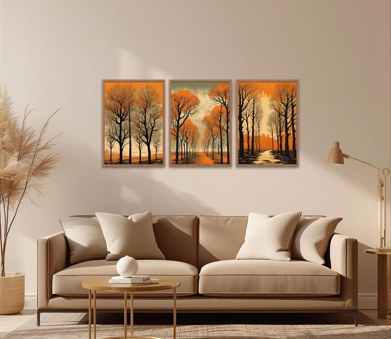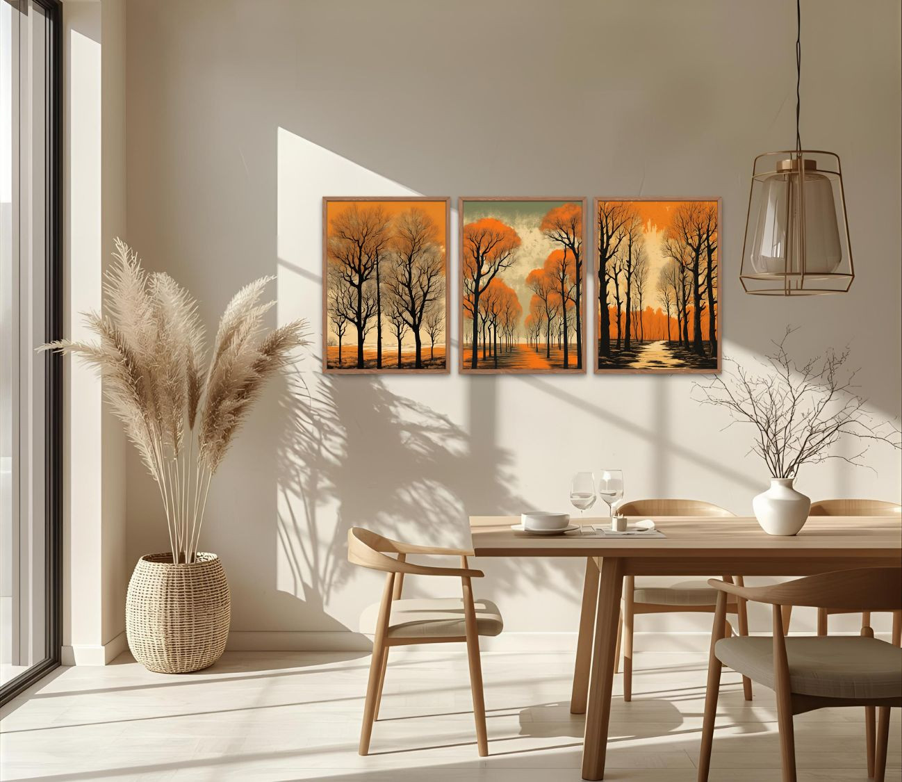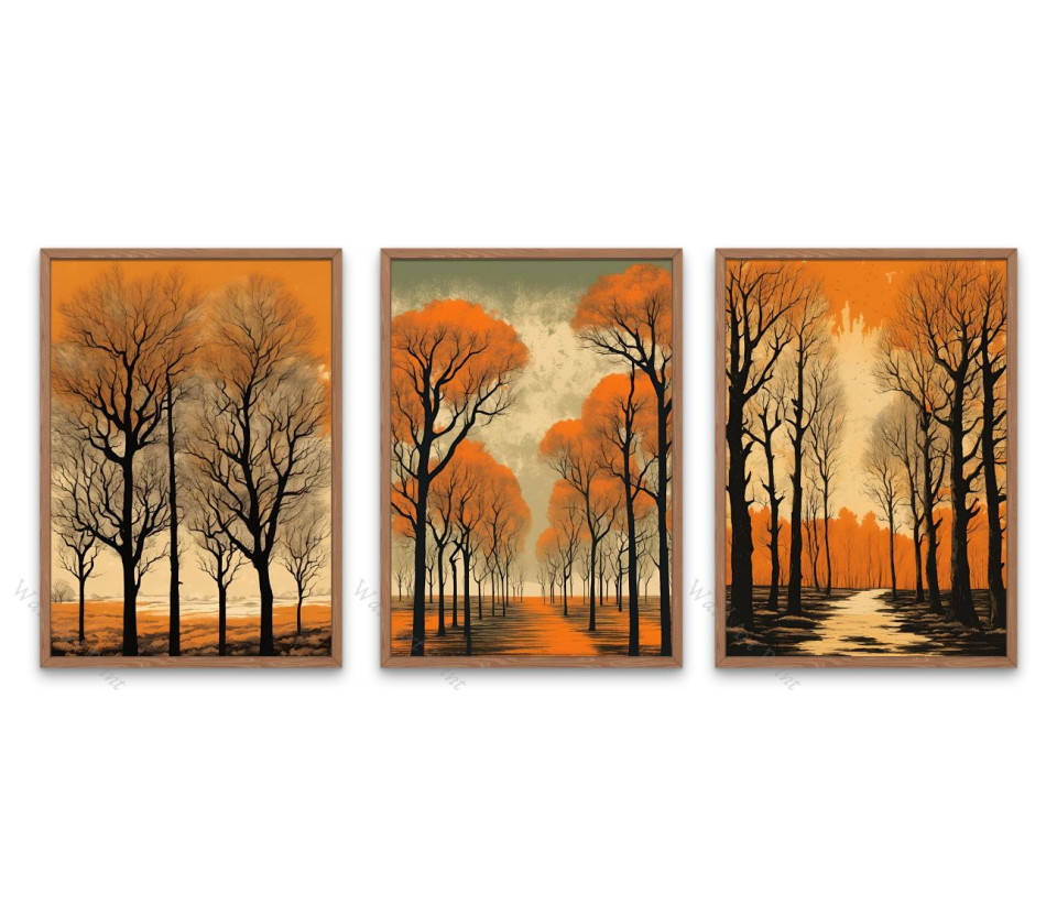 סט 3 פוסטרים מעוצבים בסגנון אמנותי מרהיב, המציגים נופים קסומים של עצים בשלל גווני כתום וחום חמים.