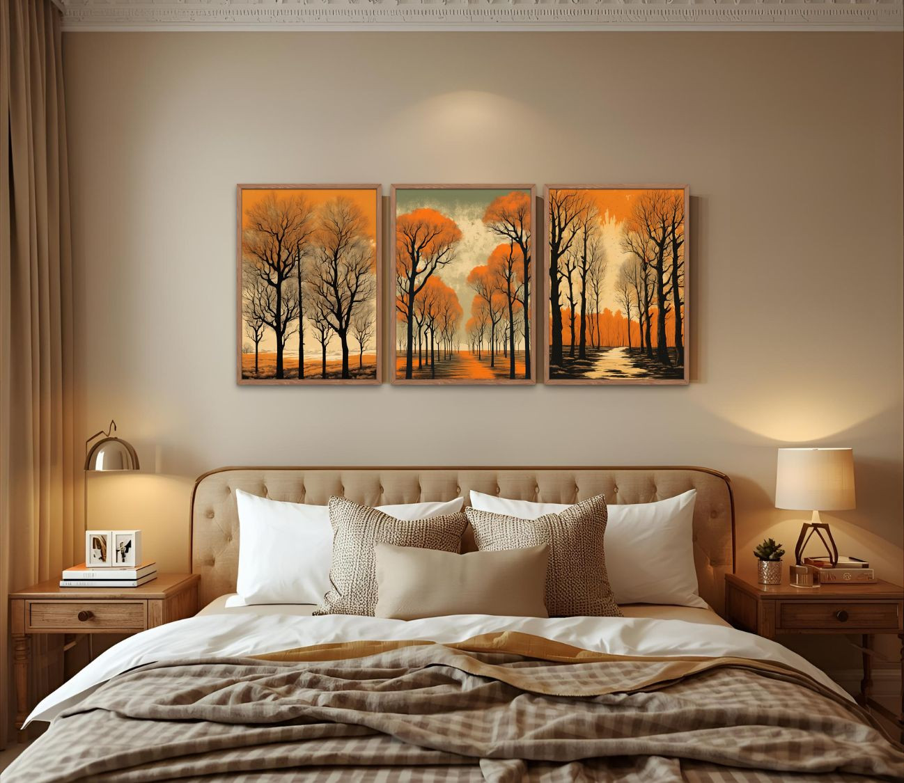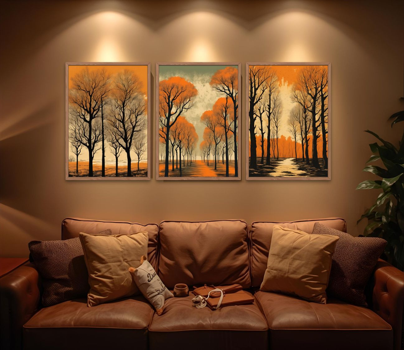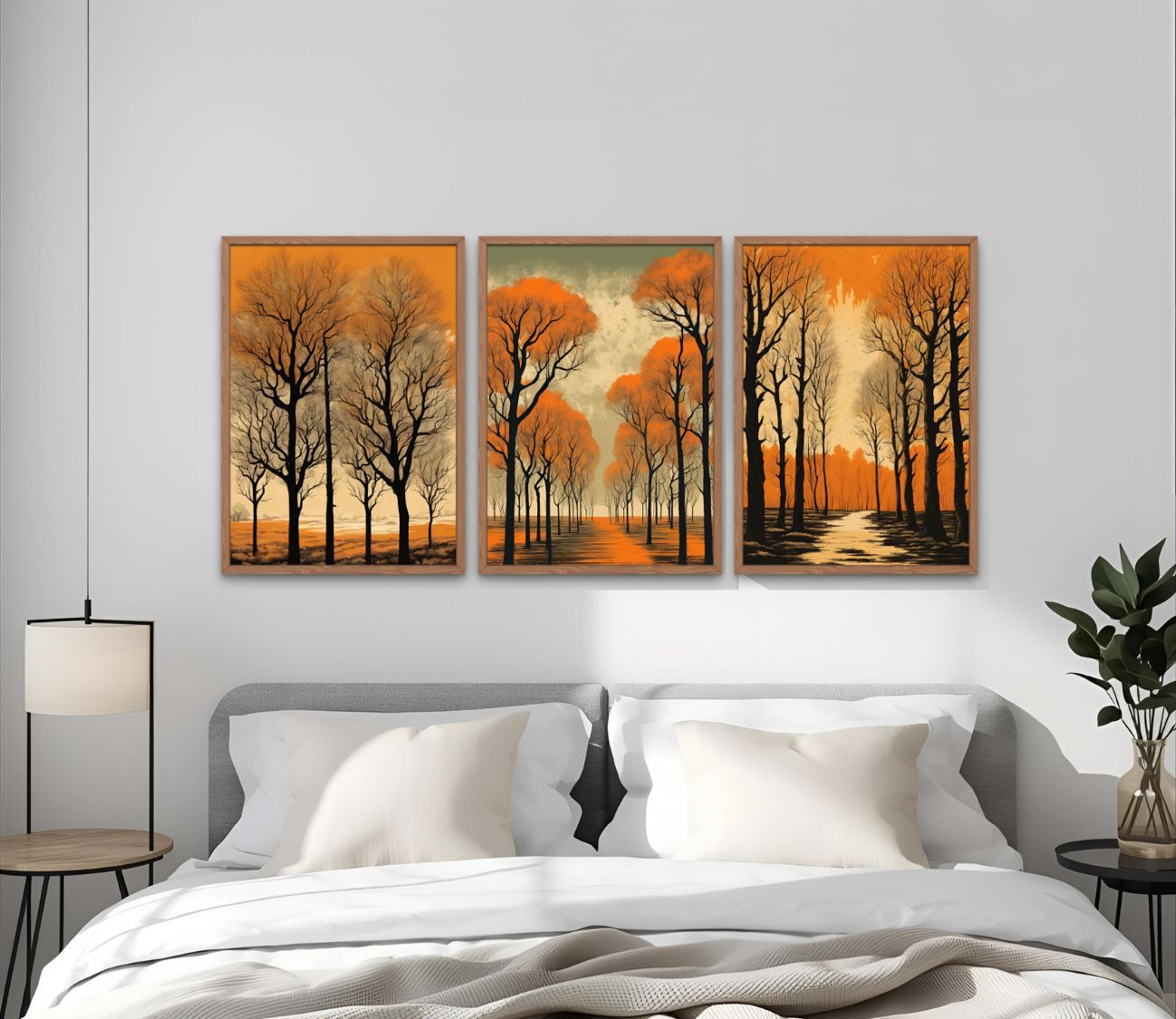 סט 3 פוסטרים מעוצבים בסגנון אמנותי מרהיב, המציגים נופים קסומים של עצים בשלל גווני כתום וחום חמים.