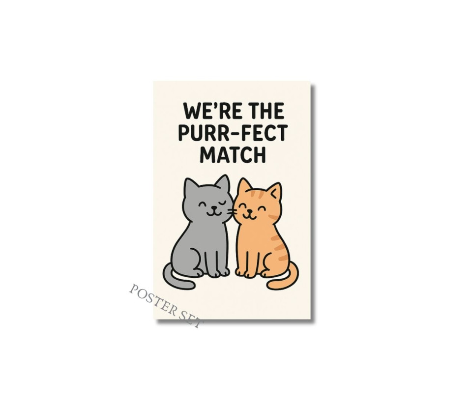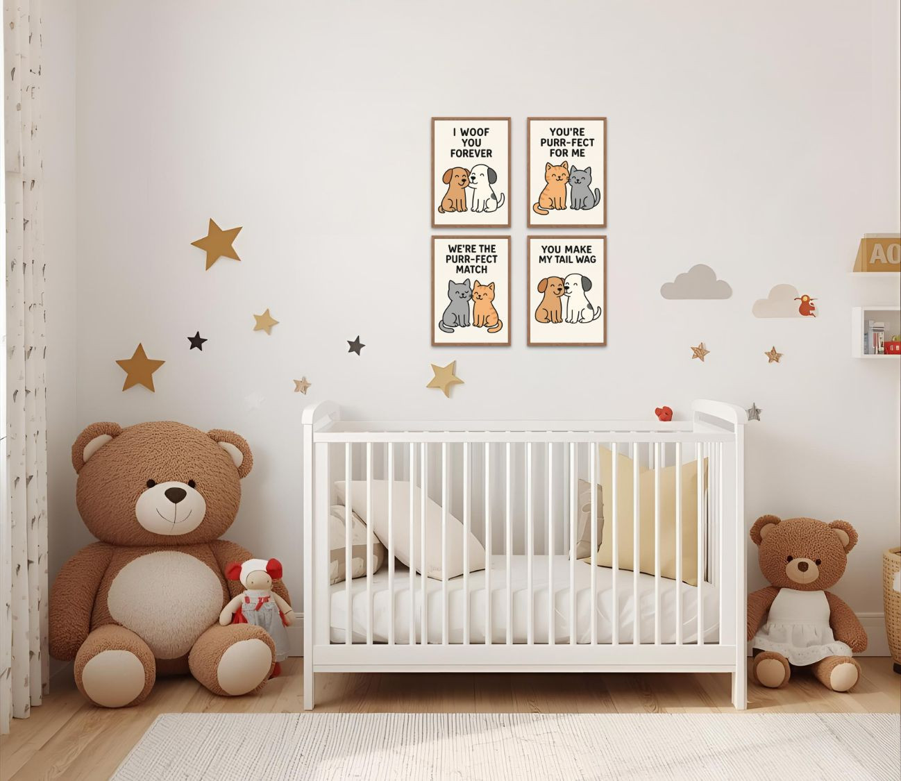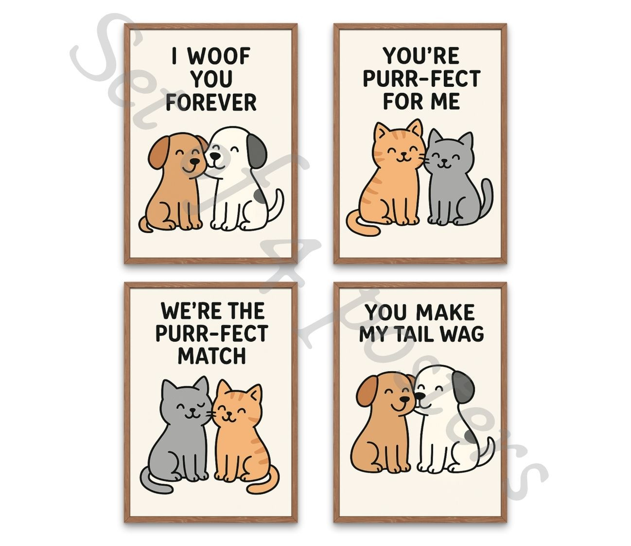הכניסו חמימות, אהבה ושובבות אל הבית עם סט מרהיב של 4 פוסטרים המציגים זוגות חתולים וכלבים מקסימים עם משפטים רומנטיים מלאי קסם.
