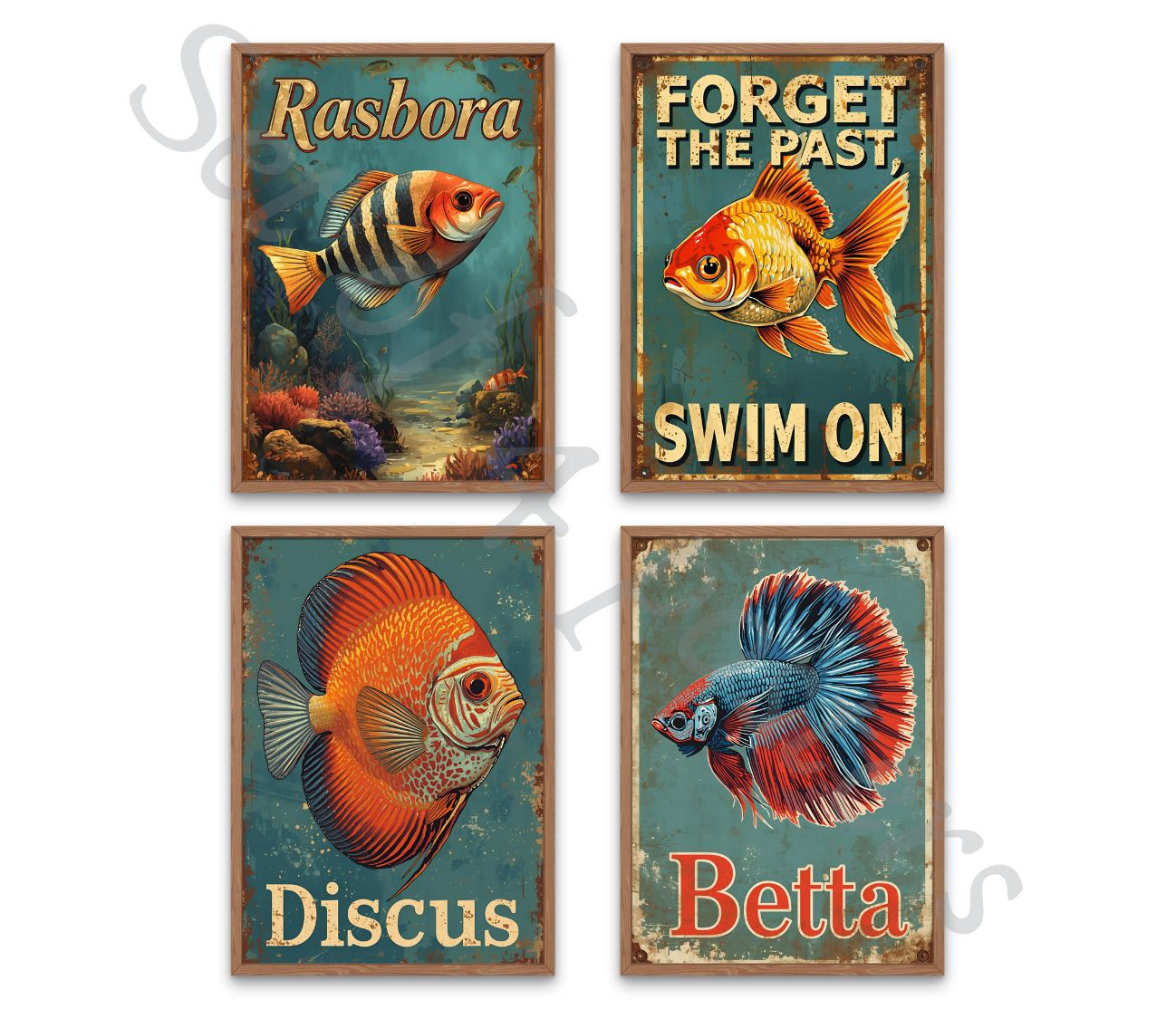 דגי נוי סט 4 פוסטרים מודפסים סגנון רטרו נוסטלגי