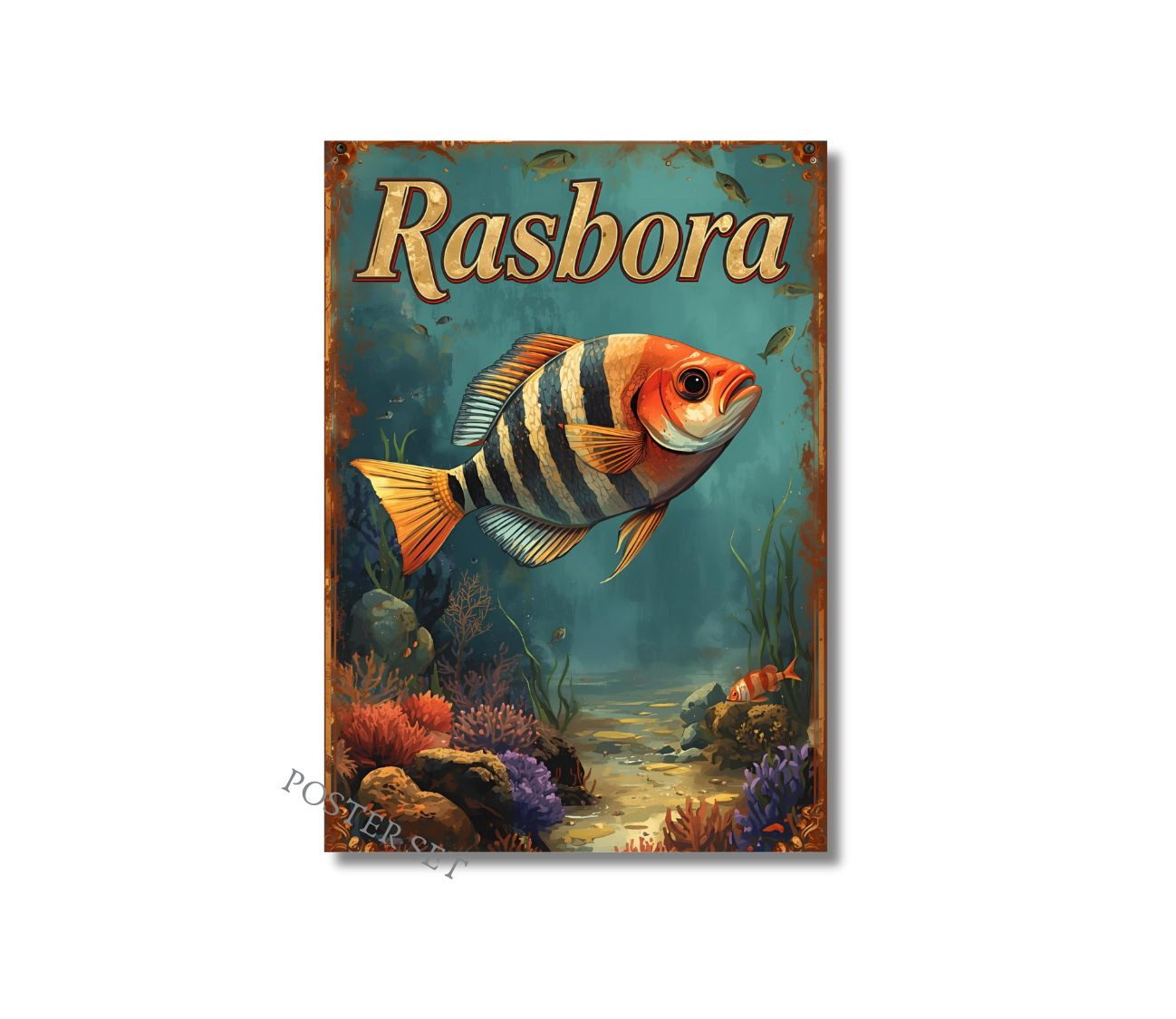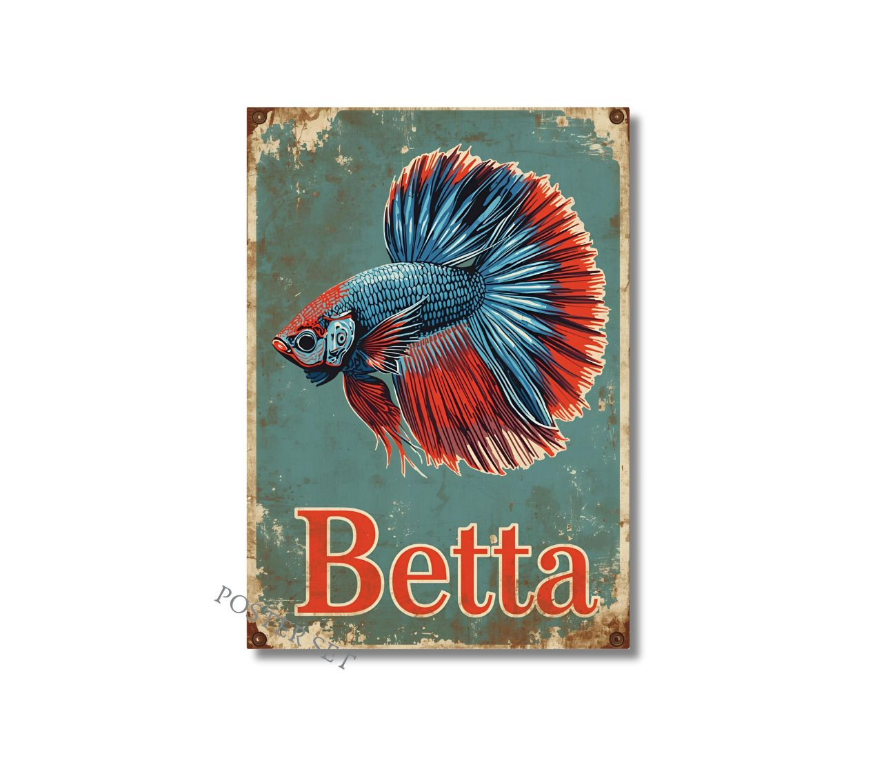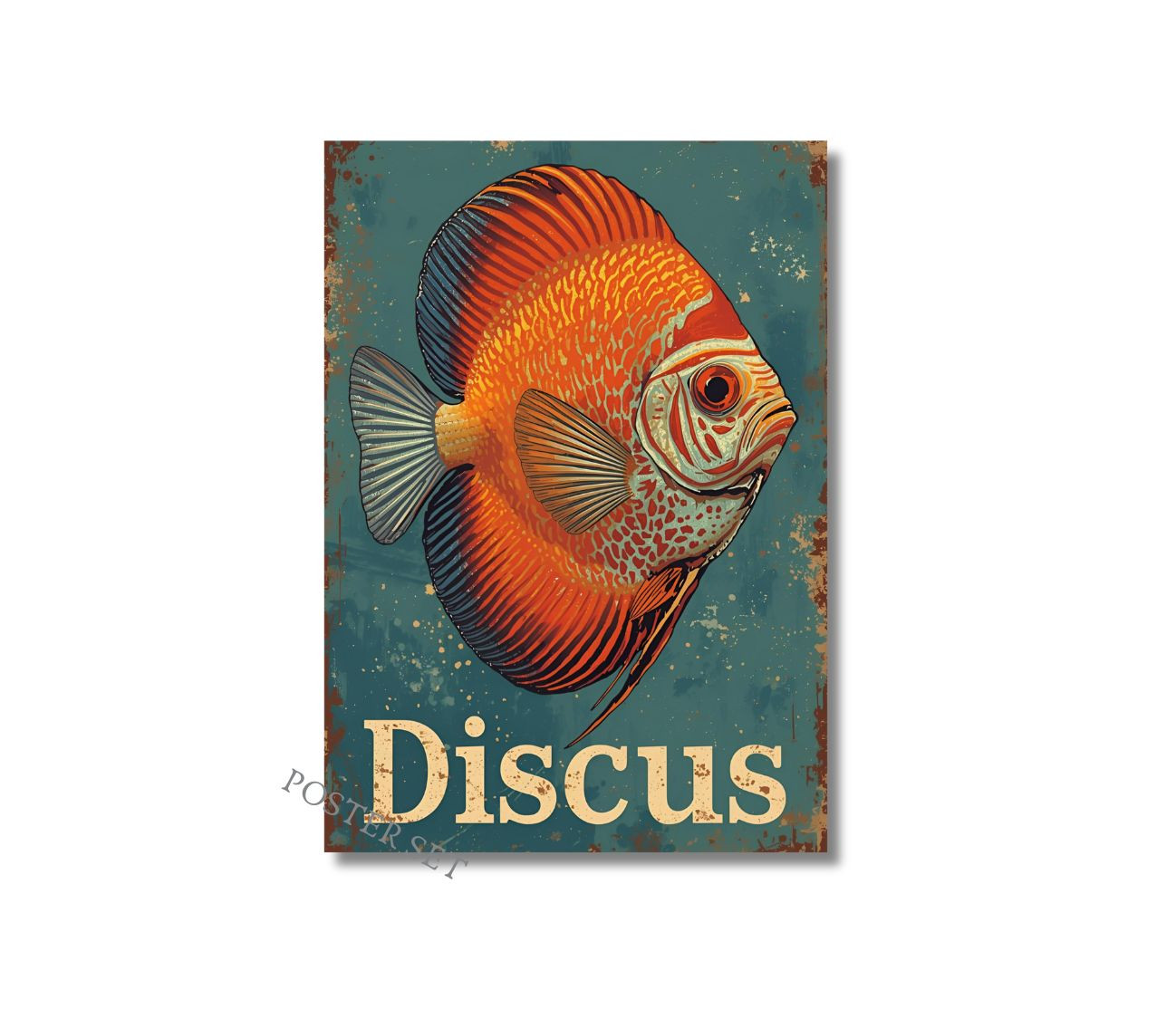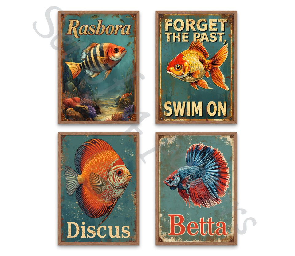 כל פוסטר מציג אחד מהכוכבים הקלאסיים של עולם האקווריומים – דג זהב, דג קרב, דיסקוס ורזבורה – בעיצוב מרהיב שמחבר בין אמנות ישנה לאהבת הדגים של היום.