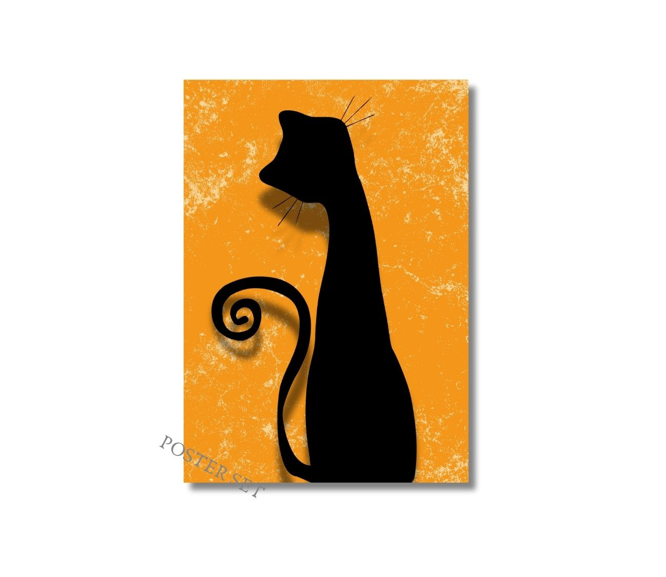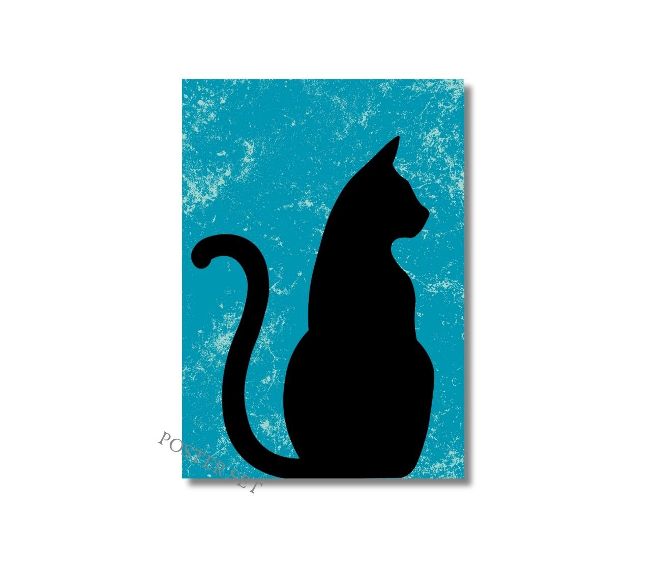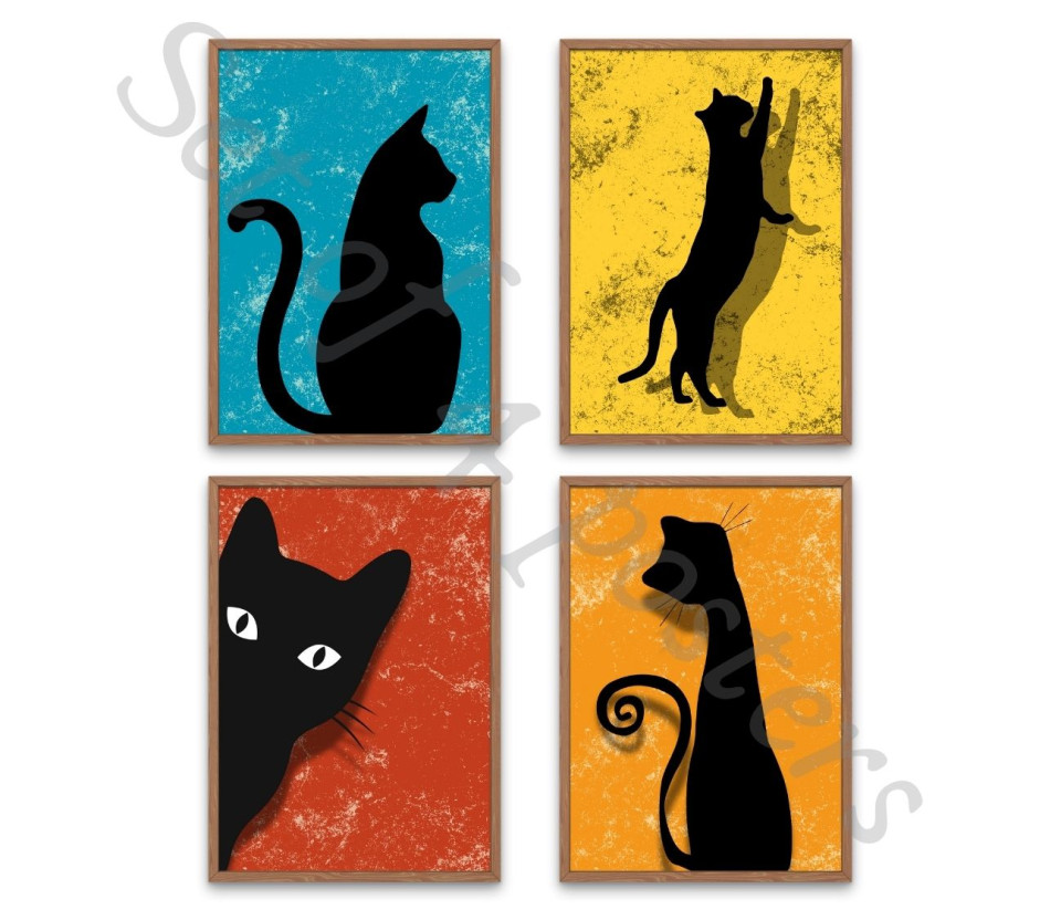 סט מרהיב של ארבעה פוסטרים בעיצוב מודרני עם צלליות חתולים אלגנטיות על רקעים צבעוניים ומרקם וינטג’ עדין.