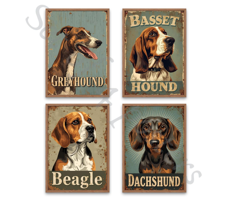 סט 4 פוסטרים כלבי ציד סגנון רטרו