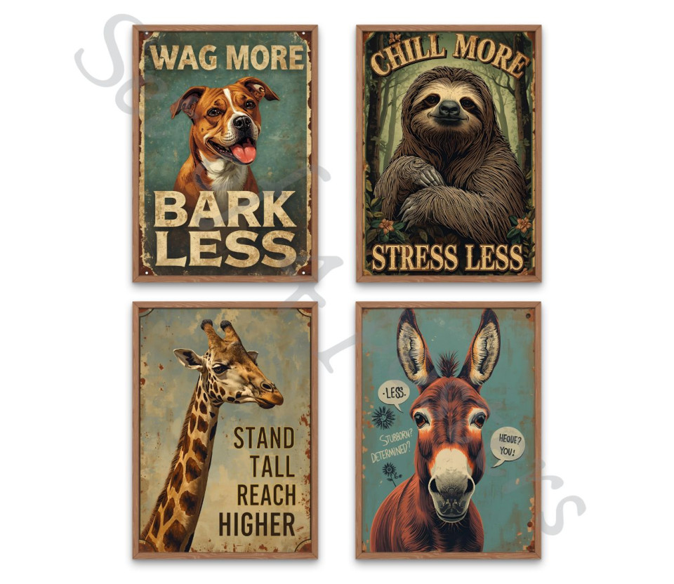 סט 4 פוסטרים חיות ומשפטי הומור – קיר מלא צחוק ואופי!