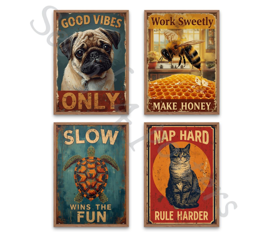 כלב חמוד עם “Good Vibes Only”, דבורה חרוצה עם “Work Sweetly – Make Honey”, צב רגוע עם “Slow Wins the Fun” וחתול מגניב עם “Nap Hard – Rule Harder”.