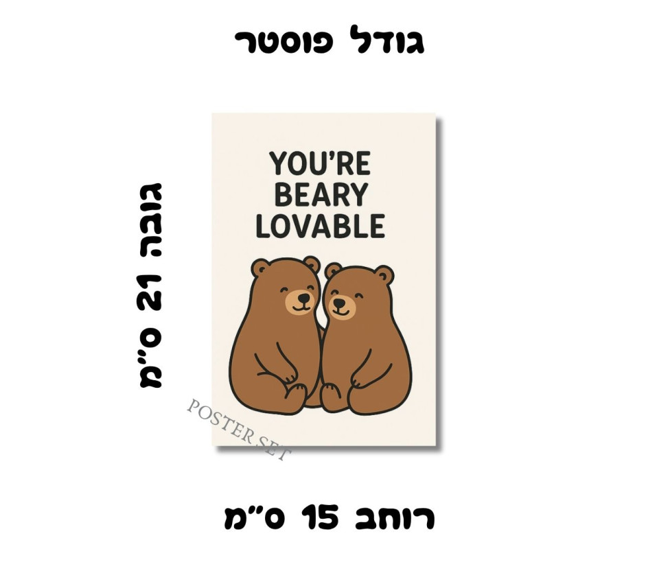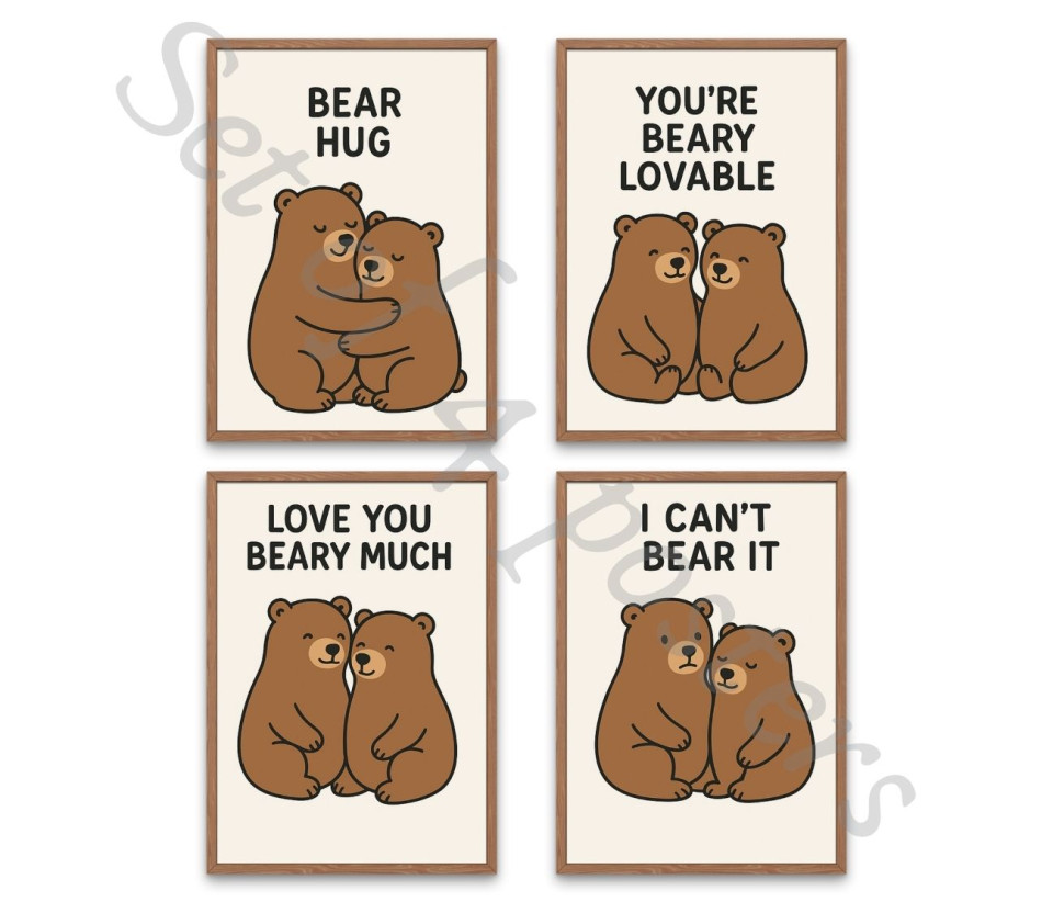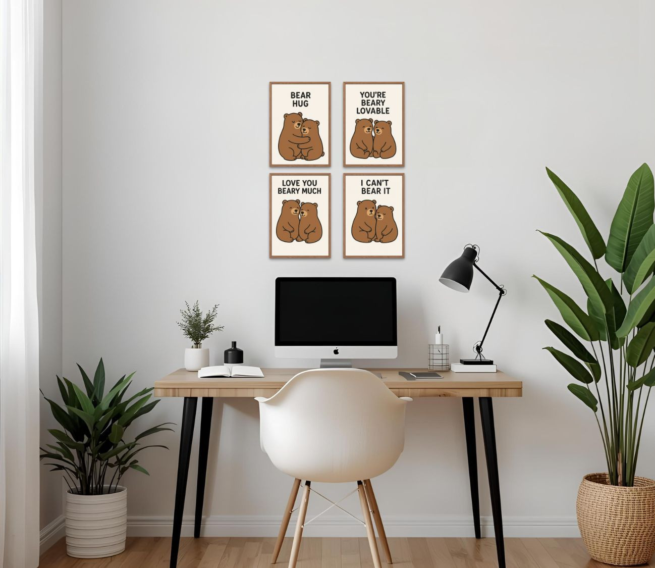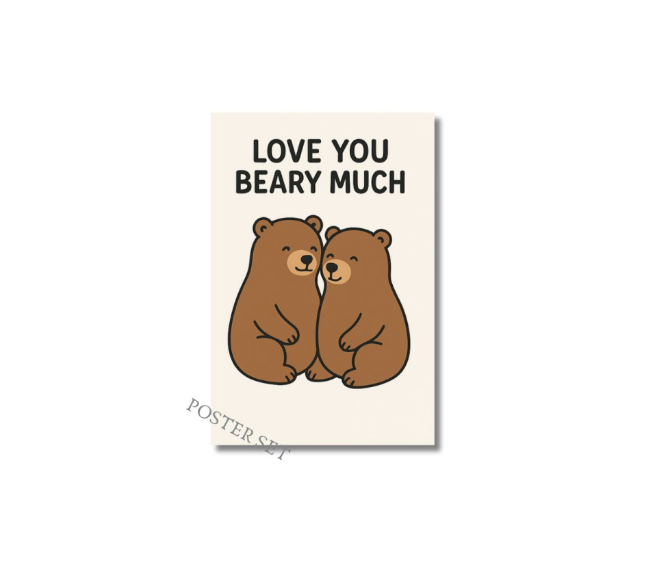 גלו את הצד הרך של הדובים עם סט מיוחד של ארבעה פוסטרים מרגשים, המציגים זוגות דובים אוהבים לצד משפטים רומנטיים מלאי חמימות.
