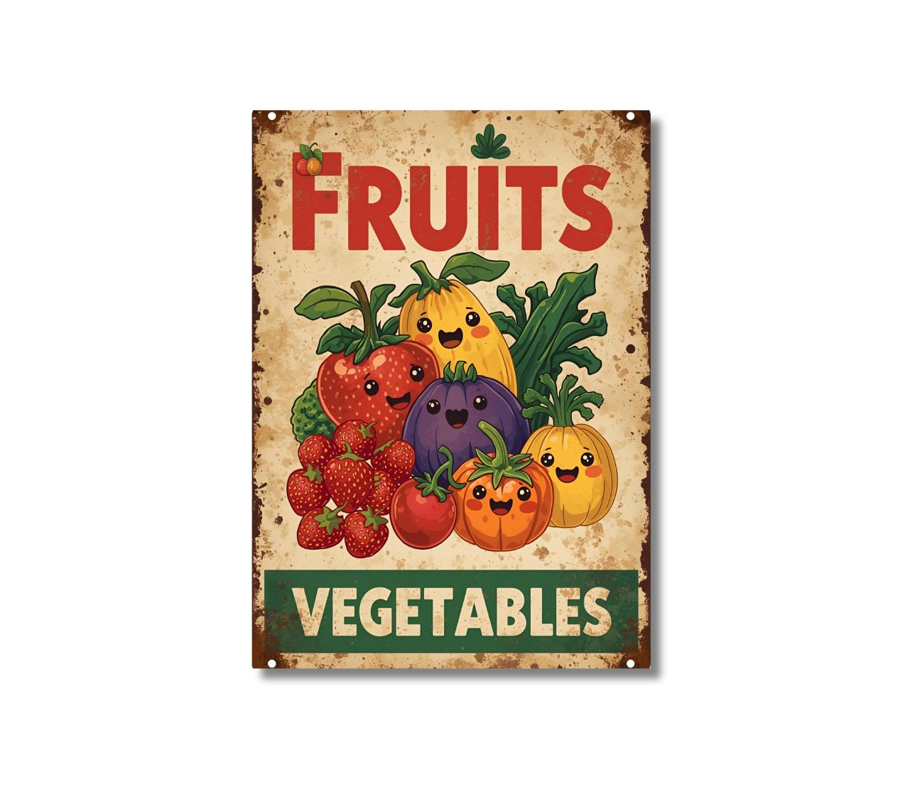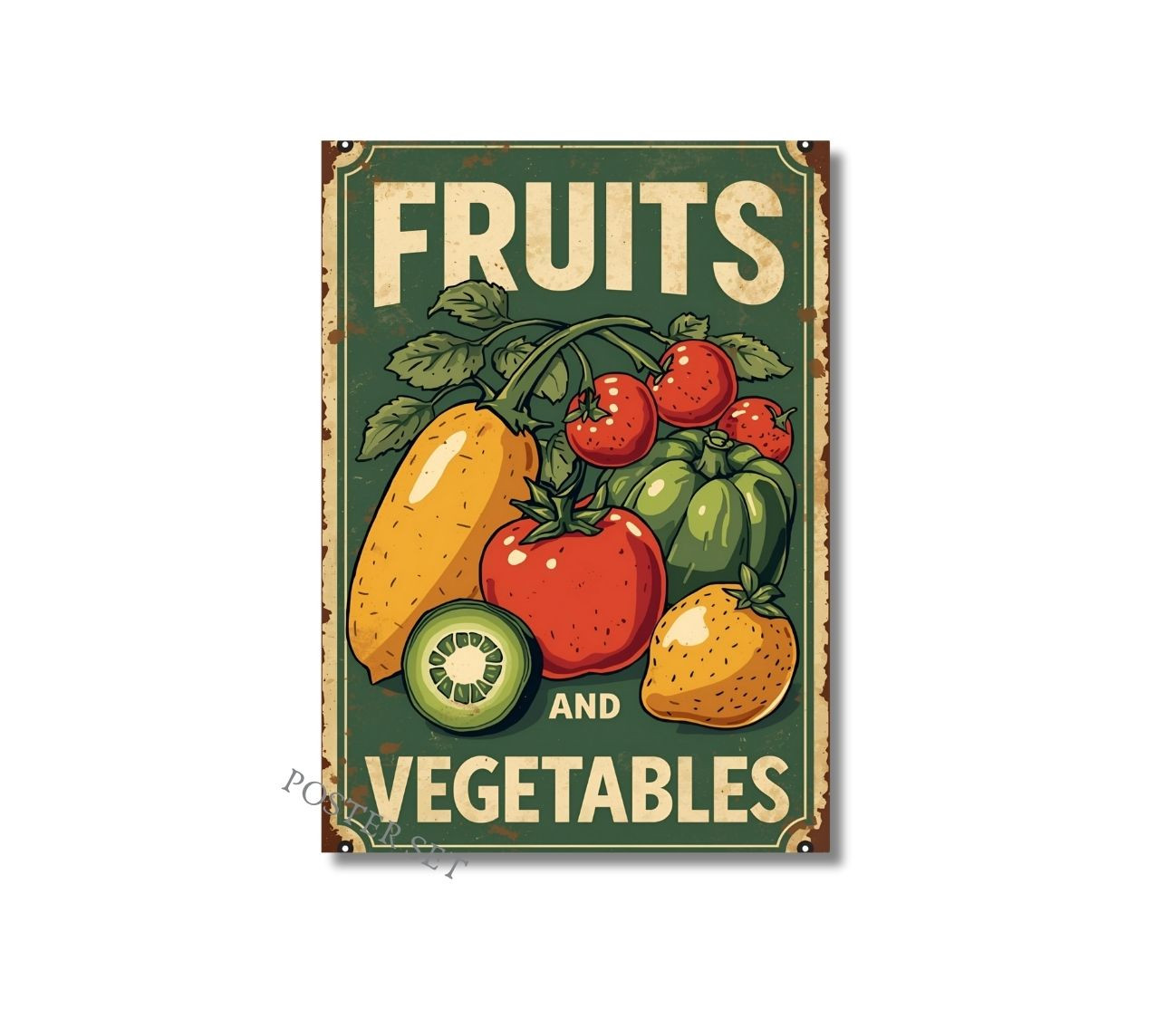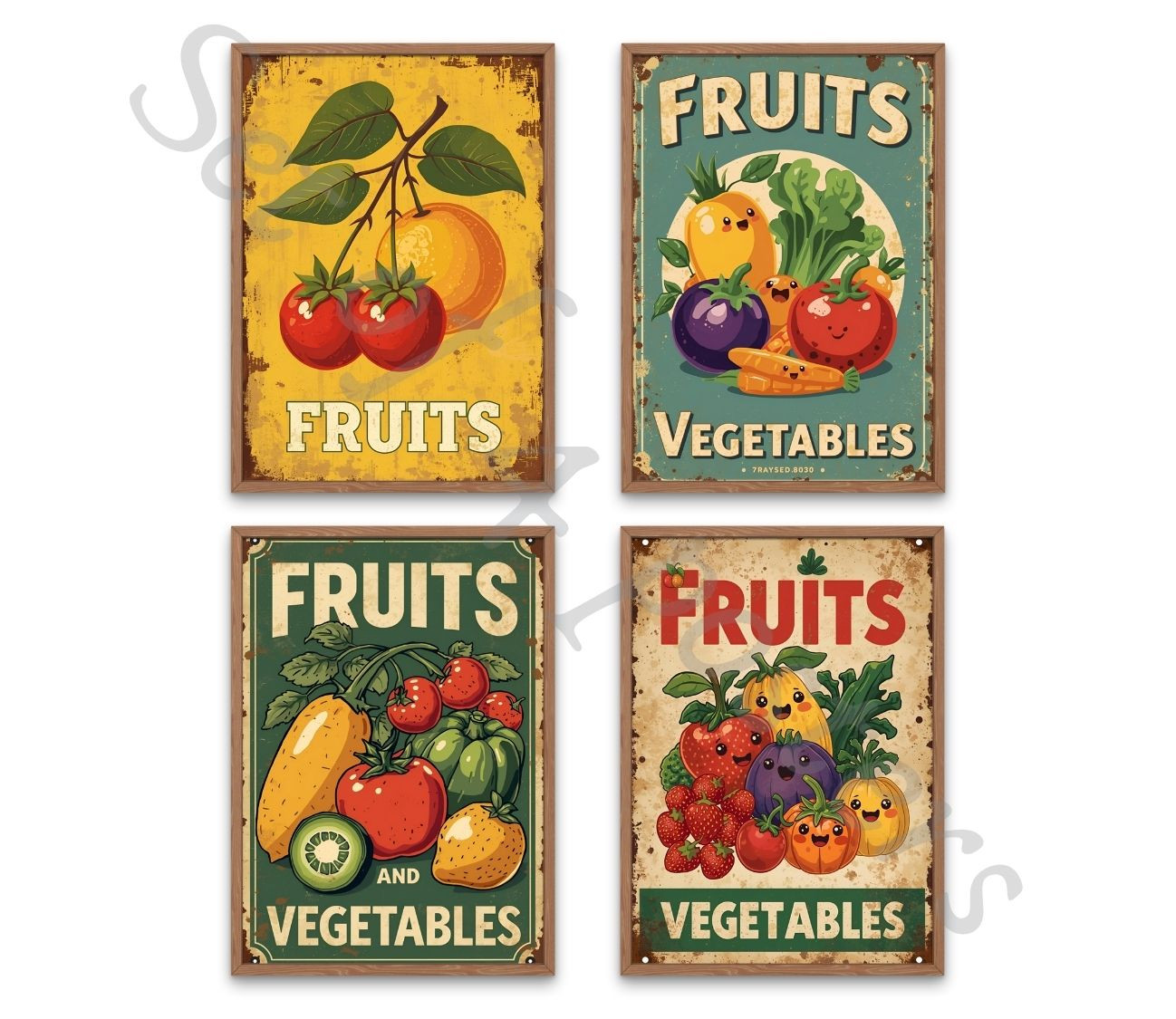 סט 4 פוסטרים מעוצבים בסגנון נוסטלגי של פעם רענן וצבעוני, המציגים פירות וירקות חיים ומלאי אנרגיה!